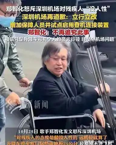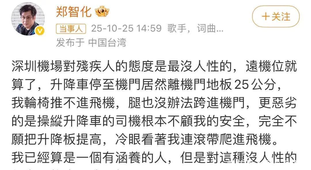 还有人说官媒和大V都出来为他发声了。其实扒开细节看,这事儿压根不是“非黑即白”的对错题。先把时间线理清楚。10月25号,郑智化发微博说在深圳机场登机时,登机车和机舱门有25厘米高差,工作人员冷眼旁观,自己只能“连滚带爬”上机,用词特别激烈,说“没人性”“忍无可忍”。