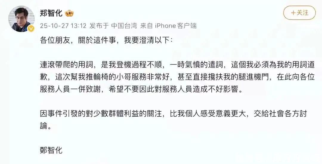 这哪是“正名”,分明是提醒大家别跑偏焦点。要说错,郑智化确实有错。他用“连滚带爬”这种情绪化的词,夸大了事实,尤其是“冷眼旁观”的指控,和监控里工作人员的主动协助完全不符。作为公众人物,说话不核实细节,很容易煽动情绪,差点让认真服务的工作人员背锅。后来他道歉说“用词不当”,也算认了这个错。